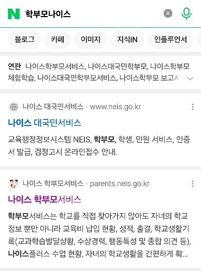 먼저, 네이버 검색창에 '학부모나이스''나이스 학부모'를 검색하세요.