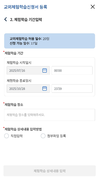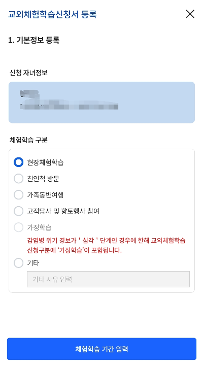 체험학습을 선택한 후에는 체험학습 사유를 작성해야 합니다.